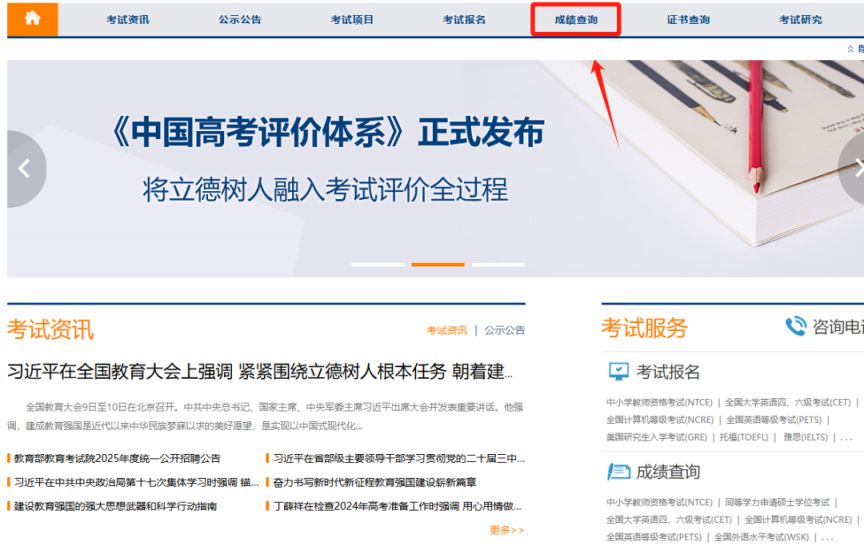 第一步:进入教育部教育考试院官网“中国教育考试网”(网址:http://www.neea.edu.cn/)点击图中所示的“成绩查询”