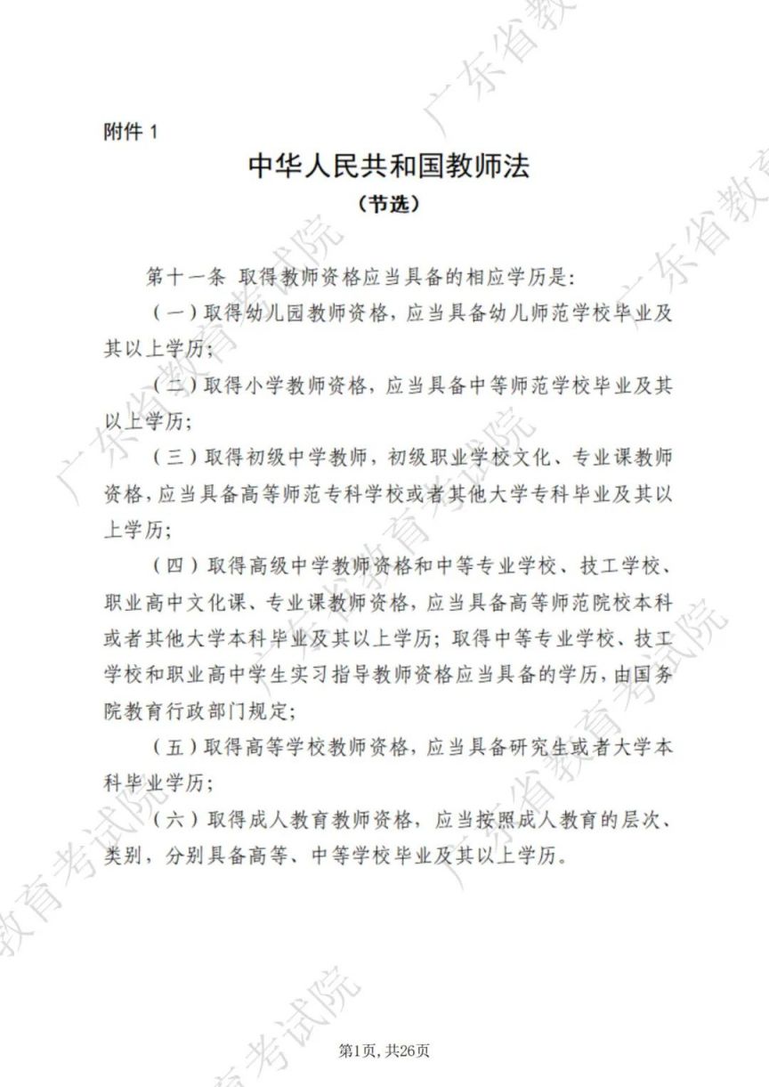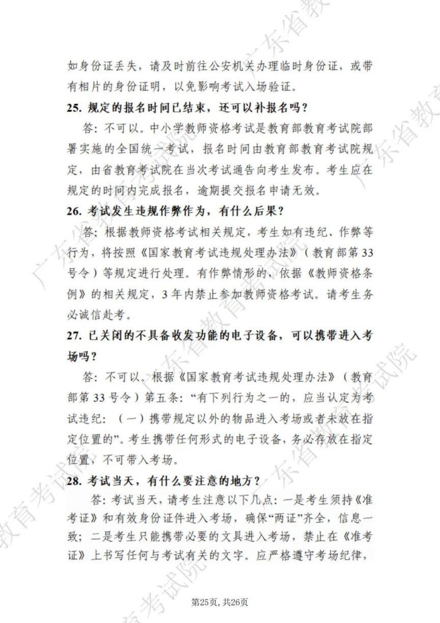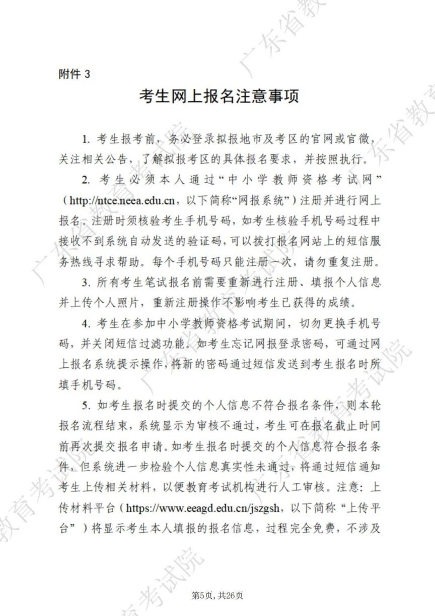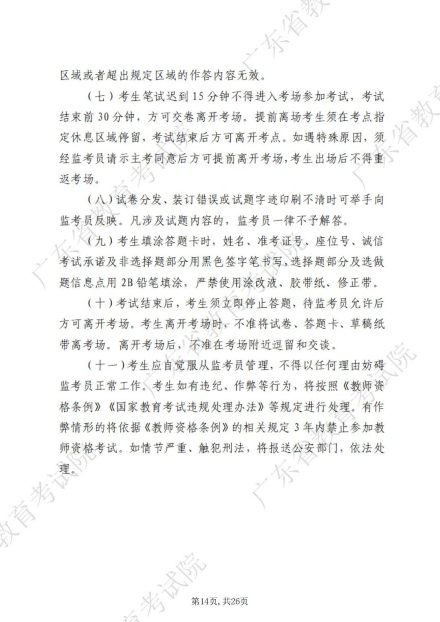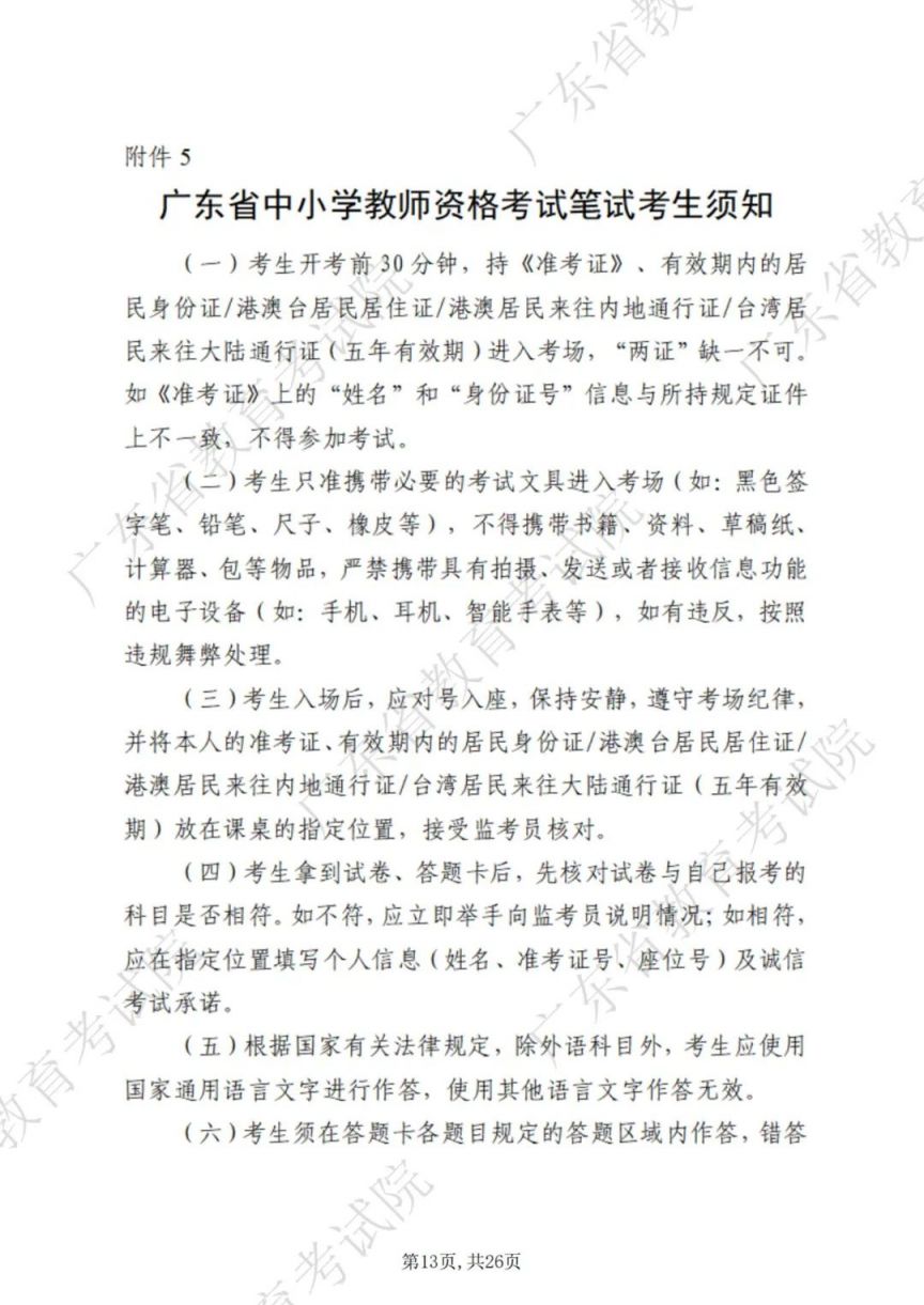 考生须仔细阅读《广东省中小学教师资格考试笔试考生须知》(附件5),并严格遵守。参加全国中小学教师资格考试的考生以及考试工作人员、其他相关人员,如有违反考试管理规定和考试纪律,影响考试公平、公正的行为,按照《国家教育考试违规处理办法》(教育部第33号令)进行处理。考生有作弊情形的,还将依据《教师资格条例》的相关规定,3年内禁止参加教师资格考试。如涉及违法行为,将移交公安机关,按照《中华人民共和国刑法修正案(九)》《最高人民法院 最高人民检察院关于办理组织考试作弊等刑事案件适用法律若干问题的解释》(法释〔2019〕13号)等相关规定执行。