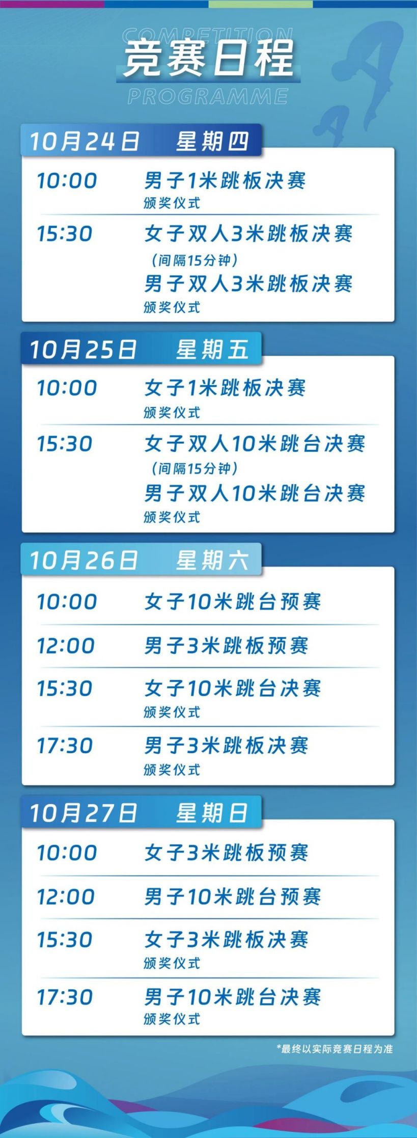 - 11月1日:开幕式及女子单人3米跳板预赛 - 11月2日:女子单人3米跳板决赛、男子单人3米跳板预赛 - 11月3日:男子单人3米跳板决赛、女子双人3米跳板预赛 - 11月4日:女子双人3米跳板决赛、男子双人3米跳板预赛 - 11月5日:男子双人3米跳板决赛、女子单人10米跳台预赛 - 11月6日:女子单人10米跳台决赛、男子单人10米跳台预赛 - 11月7日:男子单人10米跳台决赛、女子双人10米跳台预赛 - 11月8日:女子双人10米跳台决赛、混合团体决赛
