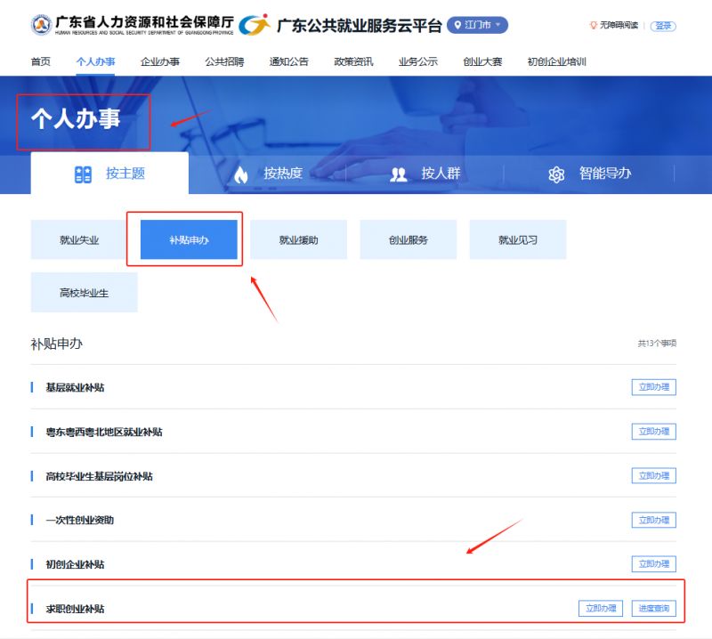 1、登录后进入【个人办事】界面,找到【补贴申办】【求职创业补贴】,点击【立即办理】;