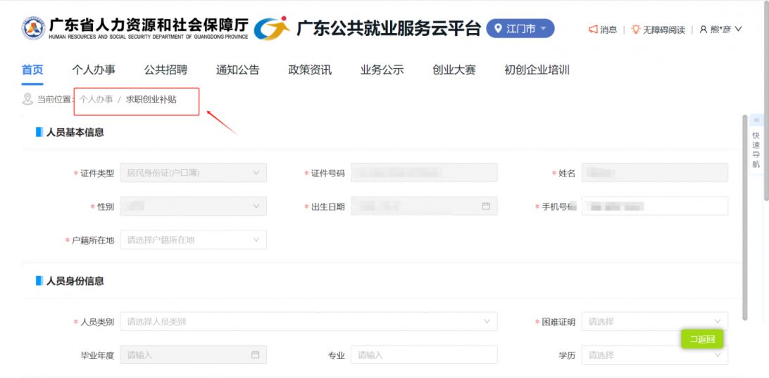 (2)在“就业创业”板块中,找到“求职创业补贴申请”事项。