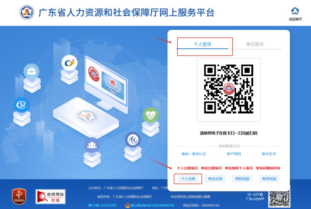 2、或者也可使用【电子社保卡】扫码登录或点击【广东省统一身份认证】通过粤省事扫码登录,减少注册、认证步骤;