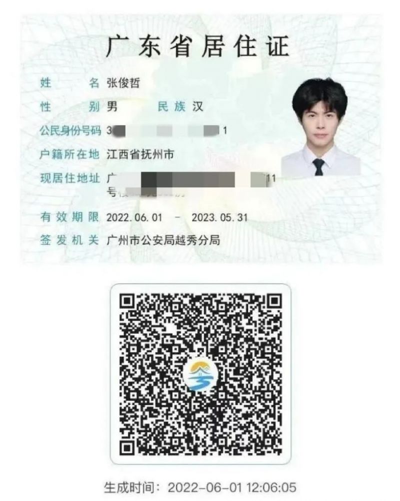 上图电子居住证样证(图中为虚拟信息)。审核通过或已经持有有效电子居住证、实体居住证的流动人员可以通过“粤居码”或“粤省事”查看电子居住证。