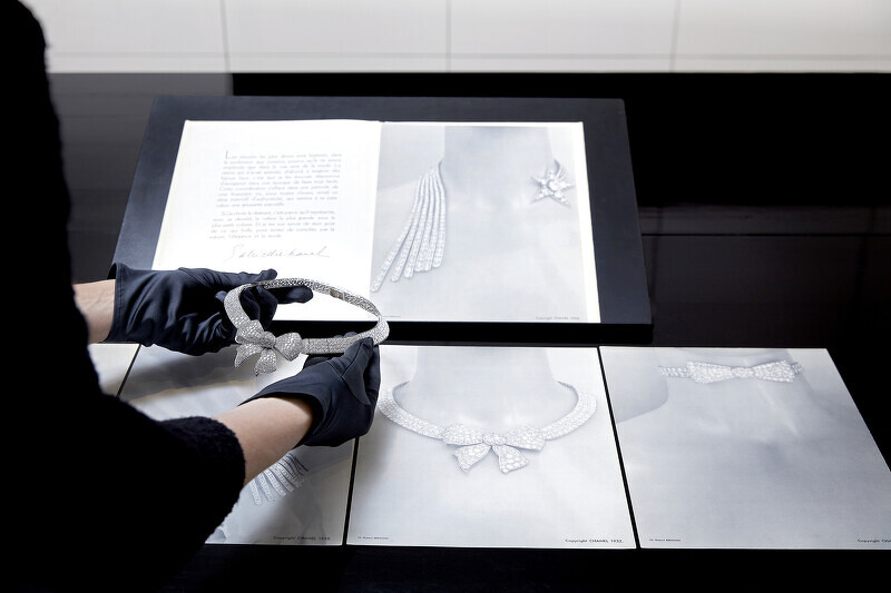 《Bijoux de Diamants》钻石珠宝系列项鍊及项鍊与手鍊,照片中文件出自 1932 年原版新闻资料及当时Robert Bresson 所拍摄的典藏照片,由香奈儿腕錶暨高级珠宝文化资产部门典藏 不只限于上述,大多数品牌诸如 Chaumet、Harry Winston、Tiffany & Co.等等皆有提供特製,它提供顶级藏家实现终极梦想的礼遇,另一方面,对品牌端来说,有办法提供这项服务,更是自家宝石蒐罗及工艺技术多种层面的实力见证,专属订製看来是双赢局面的创意平台,何乐不为?