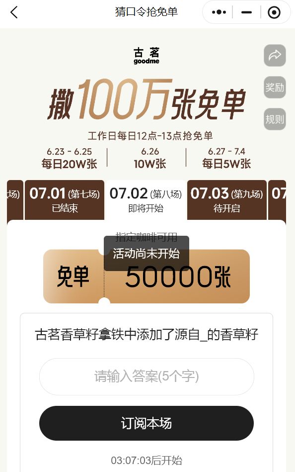 7月2日 谜面:古茗香草籽拿铁中添加了源自____的香草籽 提示:5个字 口令答案:马达加斯加 活动玩法 (1)用户可通过线下门店二维码或小程序首页进入猜口令活动页,参与猜口令,输入正确口令后,优惠券先到先得,若该场次免单券库存未抢完,则可抢到免单券*1张,若该场次免单券库存抢完,用户也可到点单页参与古茗咖啡8.9元活动(以活动页面展示为准) (2)每场奖品库存独立,免单券如当日未发完则清零,不会顺延至下一场。