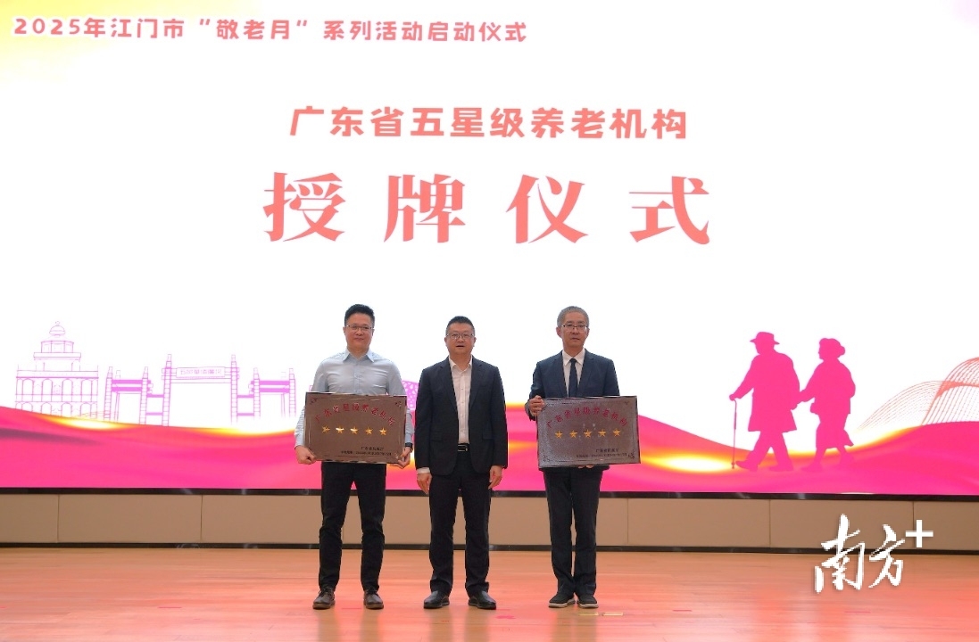 江门市民政局为两家“广东省五星级养老机构”颁发牌匾。